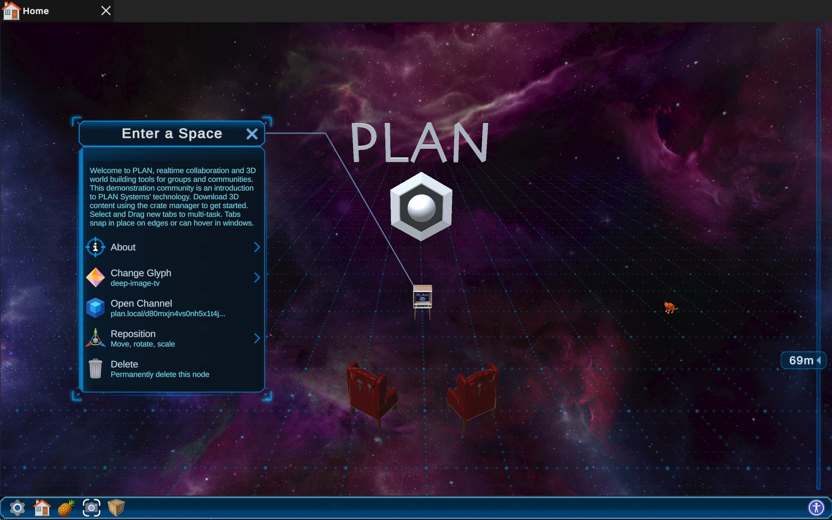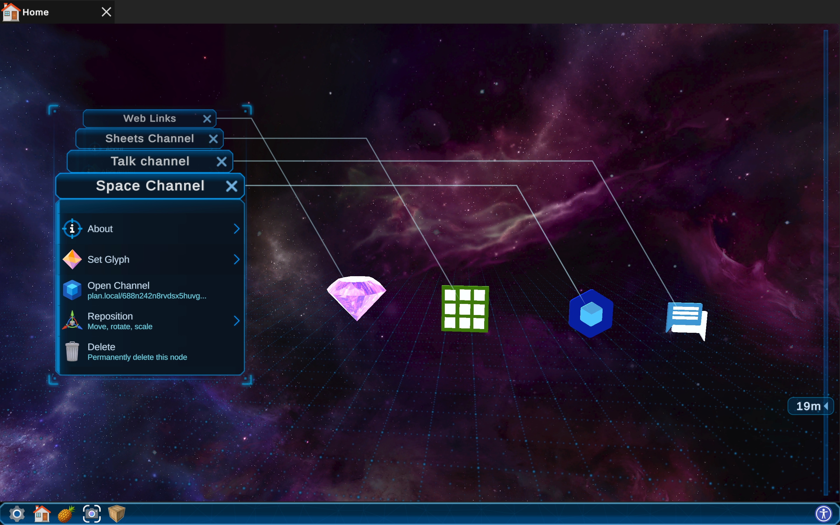 After you have loaded all of the content within the Crates, open your Home Space by selecting the Home icon in the System Settings space (accessed throught the cog icon at the bottom left of the launch bar. Your Home Space is a place to contain all your 3D content, links, and channels.